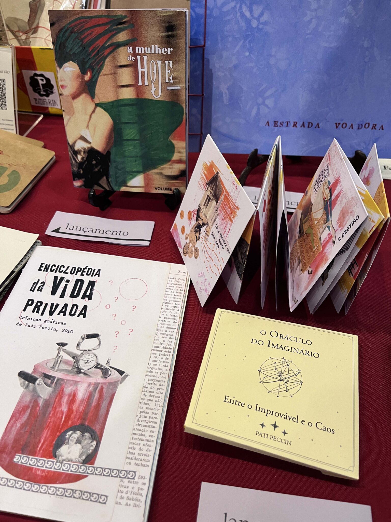 “A Estrada Voadora”: Um livro que convida o leitor a embarcar em uma jornada poética pelas memórias, reconstruídas a partir de fotografias encontradas em um álbum de sebo. “O Oráculo do Imaginário: Entre o Improvável e o Caos”: Um oráculo em forma de livro, com textos e imagens que instigam a reflexão e a busca por autoconhecimento. “A Mulher de Hoje – Volume II”: Uma coletânea de colagens que, com ironia e perspicácia, retratam a complexidade do papel feminino na sociedade atual. “Loucura e Oposição Solitária – 2ª edição”: Um fanzine que explora a técnica de cut-up e colagem em uma parceria criativa entre Pati Peccin e Aleph Ozuas.